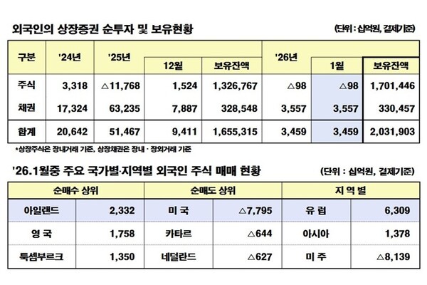 주식시장에서는 외국인들이 한 달 만에 다시 순매도세로 돌아섰다. 유가증권시장에서 3610억원을 순매수한 반면, 코스닥시장에서 4590억원을 순매도한 결과 전체적인 매도 규모가 커졌다. 유럽과 아시아 지역의 투자자들은 국내 주식을 대량 매수했지만, 미주 지역에서는 8조1000억원의 대규모 순매도가 일어났다. 아일랜드와 영국이 순매수 상위에 오른 반면, 미국과 카타르는 순매도세를 보이며 대조적인 모습을 보였다.