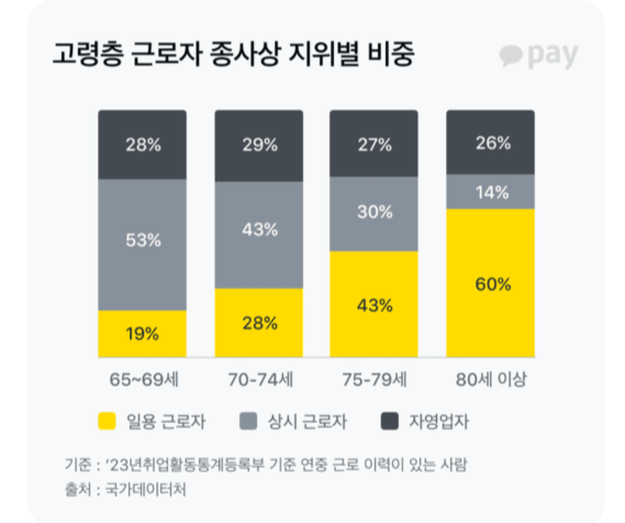 고령층 근로자 중 상시 근로자는 42.8%에 그치고, 나머지는 일용 근로자와 자영업자로 나뉜다. 특히 연령이 높아질수록 고용의 불안정성은 심화된다. 65~69세는 상시 근로자 비중이 절반을 넘지만, 80세 이상에서는 일용 근로자 비중이 60%까지 증가한다. 성별 격차도 존재하여, 80세 이상 여성의 경우 71.6%가 일용직에 종사하고 있다. 이들 근로자의 연평균 근로일수는 258일로, 노동 강도도 만만치 않다.