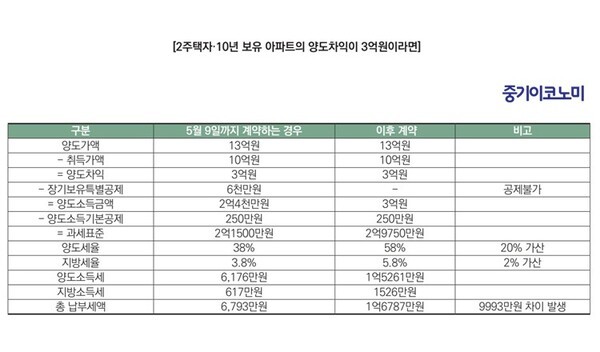 예를 들어보자. 2주택자가 10년 동안 보유한 아파트를 10억원에 매수하여 13억원에 매도한다고 가정하자. 만약 이 계약이 5월 9일 이전에 체결되었다면, 중과세율 적용 없이 양도소득세를 부담하게 된다. 그러나 그 이후 계약을 체결했다면, 중과세율과 장기보유특별공제 배제가 동시에 적용되어 세금 부담이 크게 늘어난다.
